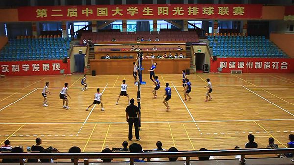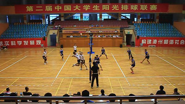 对手是福建的高校,每年的福建省的大学生排球赛就在漳州这次的比赛场地进行,对方占有天时地利。果然开局对方气势很胜,依靠连续的进攻给我方施压,虽然赛前的准备会已经反复强调,但普通生队伍心理素质不稳定,起伏大,开局一直被对手压制,战至局末段,仍然以16:20落后四分,经过教练的暂停部署,通过加强发球抓往返球,打出了一个小高潮,最后逆转获得第一局的胜利。第二局相对轻松一些,领先比较多获胜。第三局对手破釜沉舟,放手一搏,我方有些顶不住对方的压力,频频失误,比分又是一路落后,最后通过换人调整防守阵型等方式与对手周旋,慢慢的赶了上来,最终27:25获胜,3:0取得比赛胜利。