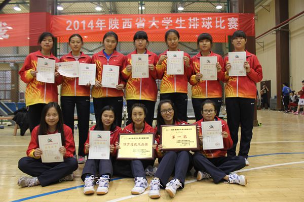 11月10日,2014年陕西省大学生排球联赛在西安交通大学落下帷幕。经过进一个星期的激烈争夺,我校男女排球队双双荣获冠军。这是继去年我校男女两队在在该项赛事中折桂之后,同时卫冕成功。此外,我校还获得本次比赛的体育道德风尚奖。男排队员杨威、吴运龙,女排队员刘亦佳、杨艺获得优秀运动员称号。