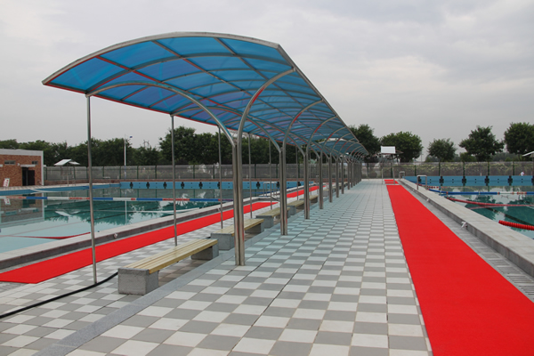 此次游泳池改扩建工程采用国内目前较为先进的循环净化水系统,具有安全、卫生、节水的特点,同时还配备了遮阳设备,安装了太阳能热水器等。