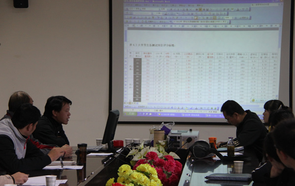 会议由体育部主管体质测试工作的副主任傅强主持,各学院体质测试工作负责人和体育部各学院体育辅导员参加了会议。会上,体育部主管群体工作的副主任马文军宣布了各学院《学生体质健康标准》测试的负责人和体育部各学院体育辅导员;傅强副主任对《学生体质健康标准》情况进行了介绍并部署我校2012年学生体质健康测试工作;体育部学生体质测试中心主任马平军对我校2012年《学生体质健康标准》测试的具体要求和注意事项做了详细说明。
