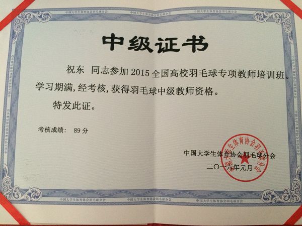 通过培训,我校体育部教师祝东进一步学习了羽毛球教学方法,提高了羽毛球技术水平,交流了羽毛球教学经验。在培训结束的考核中,以优异的成绩通过了考核。即2013年取得“全国高校羽毛球中级教练员”资格后再次获得“全国高校羽毛球中级教师”资格。