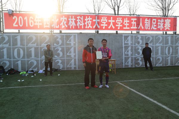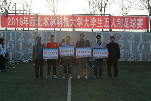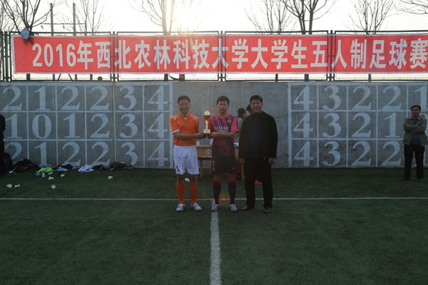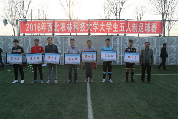 我校2016年大学生“五人制”足球比赛共有18个学院学生和教工队参加。经过8天的激烈角逐,动科学院和教工队获得并列第一名,第2名至第8名的队伍分别是机电学院、风景园林艺术学院、生命学院、林学院、经管学院、食品学院和水建学院;生命学院、理学院、葡酒学院和林学院获得“体育道德风尚奖”;动科学院的陈宁博同学获得“优秀运动员奖”。体育部吴继东主任、魏景刚书记到为获奖球队和队员颁奖。