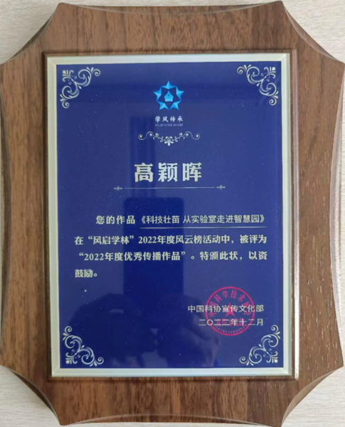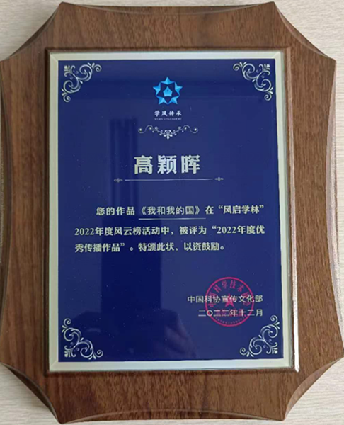 近日,在中国科协举办的“风气学林”2022年度风云活动榜中,高颖晖副教授的原创MV《我和我的国》以及课堂拓展片《科技壮苗—从实验室走进智慧园》荣获2022年度风云榜“优秀传播作品”奖,这是体育部老师首次获此殊荣。