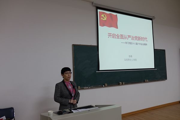 李娜以“开启全面从严治党新时代”为题,对十八届六中全会的基本情况和重大意义、全会审议通过的《关于新形势下党内政治生活的若干准则》和《中国共产党党内监督条例》主要内容和突出亮点、以及坚决维护中央权威、牢固树立“四个意识”等4个方面进行了阐述。重点讲解了新形势下加强和规范党内政治生活、加强党内监督的必要性和重要性、全会提出的重大理论观点和重大举措,以及全会对全党特别是领导干部的要求等。