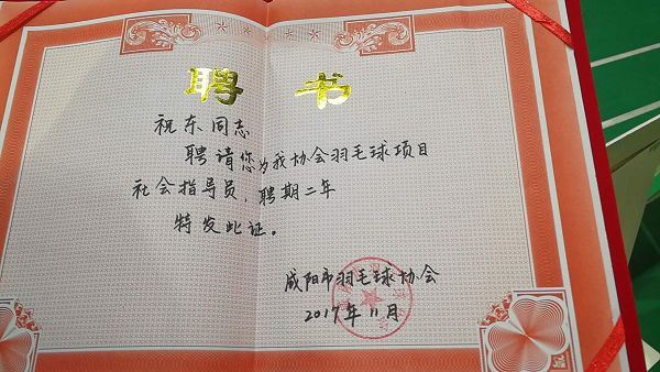 因在羽毛球运动推广和宣传上做出的贡献,我校体育部教师祝东老师被咸阳市羽毛球协会聘为羽毛球项目社会指导员,聘期两年。