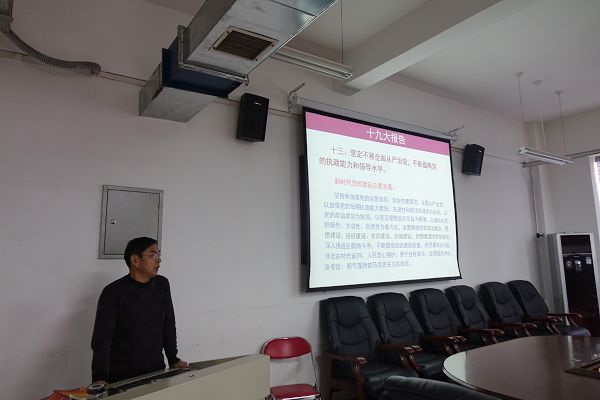 会上,部党总支书记魏景刚领学了报告第十三部分。他把这部分的主要内容提纲携领从8个方面进行了归纳,解读了坚定不移从严治党,不断提高党的执政能力和领导水平的具体内涵,对党面临的形势、考验、危险及存在的问题进行了分析,概括了新时期党的建设的总体要求内容。在领学中,他对加强党的基层组织建设谈了自己的体会,指出党在新时代担负着重大的历史使命,党的路线方针政策都需要通过基层组织来完成,就像人们说的“上面千条线,下面一根针”,只有把基层组织组织建设成为宣传党的主张、贯彻党的决定、领导基层治理、团结动员群众、推进改革发展的坚强的战斗堡垒,才能将各项任务落到实处,实现十九大提出的宏伟目标。