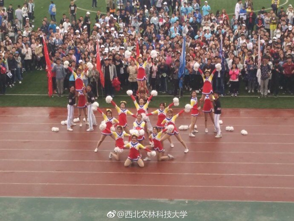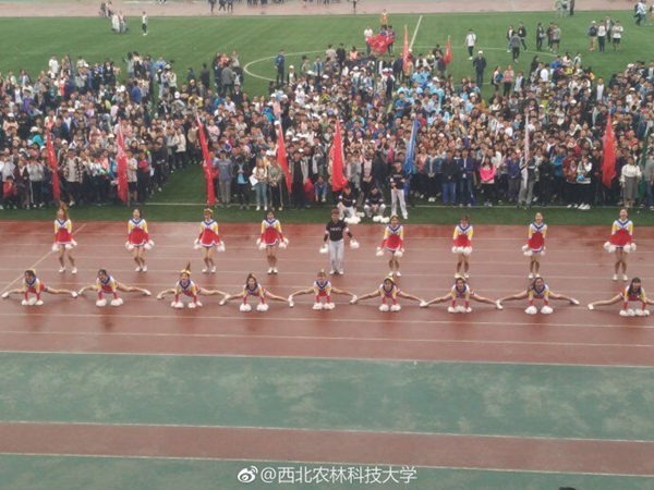 先前天空飘着小雨,跑道上有些许积水,跑道也变得湿滑。虽然条件比较辛苦,可啦啦操队员的热情丝毫不减,节目中有滚地的动作,他们并没有因为积水而畏惧,反而更加认真的完成操化动作.雨水弄脏衣服,跑道划破膝盖,不能阻止我们的热情和体育精神,赢得了同学们的阵阵掌声。而随后的技巧类动作,例如托举、下叉、高踢腿等,更是夺得了全场欢呼!