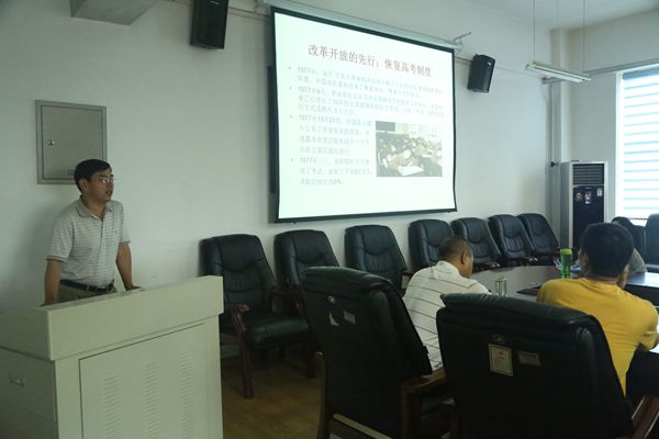 活动的第一项内容是专题党课。部总支书记魏景刚为与会党员讲授了《改革树丰碑,辉煌四十年》的主题党课。党课以恢复高考制度和家庭联产承包责任制为先行,党的十一届三中全会为号角的改革开放40年波澜壮阔的发展过程为主线,从国民经济总体发展以及教育、农业等方面入手,通过详实的数据和生动的图片展示了改革开放四十年来我国国内生产总值,大学数量、招生人数、在校学生人数,粮食总产量和人均粮食产量,以及和我们每个人息息相关的衣食住行等方面发生的巨大变化和取得的辉煌成就,阐述了改革开放的重大意义。通过聆听党课,使与会党员深受震撼,体会到只有社会主义才能救中国,只有改革开放才能发展中国,改革开放是大势所趋、人心所向,党的正确领导是改革成功的关键。新时代全面建成小康社会,进而建成富强民主文明和谐美丽的社会主义现代化国家、实现中华民族伟大复兴的中国梦,迫切要求全面深化改革,每位党员都要作改革的拥护者、参与者和推动者。