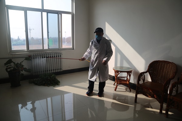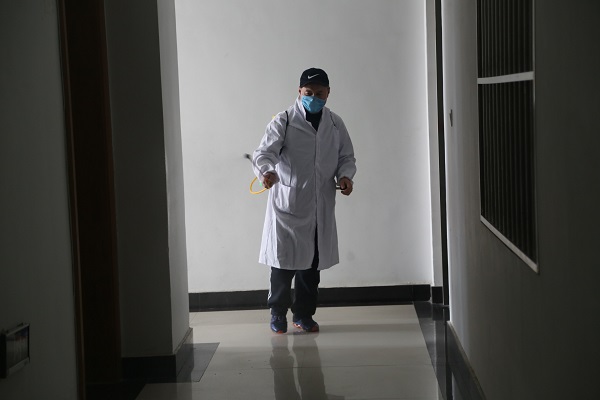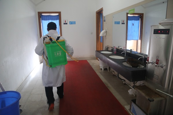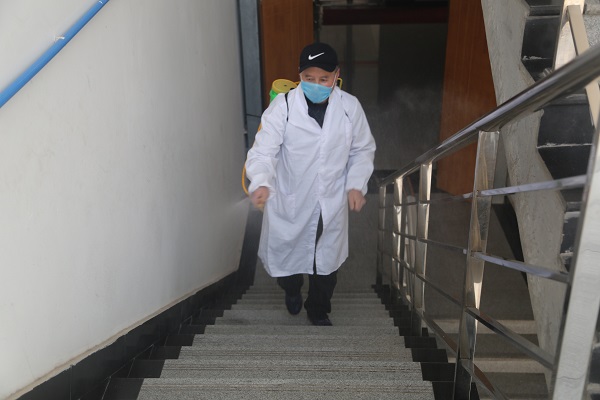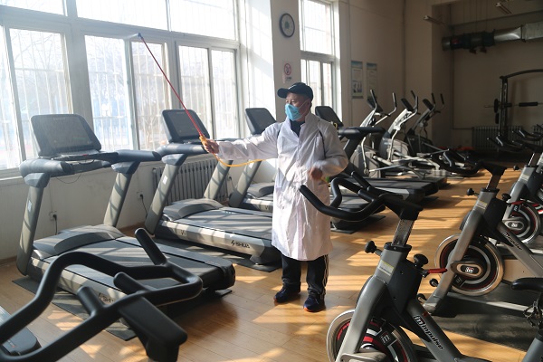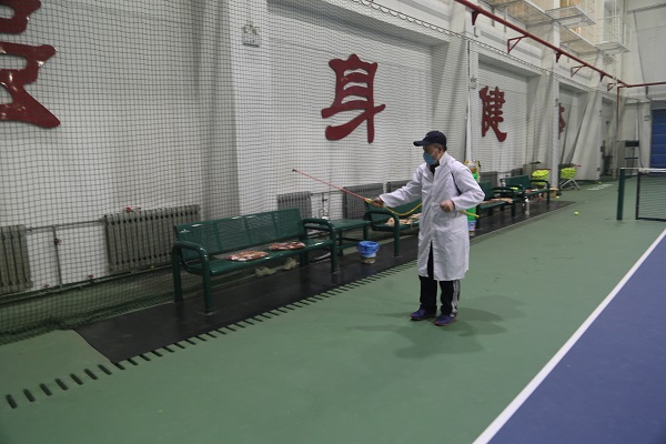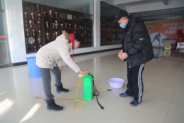 第四,场馆管理人员对场馆实施消毒处理。场馆值班人员按照要求配置消毒液对小球馆及田径场一楼大厅进行消毒处理,做好疫情防控工作。