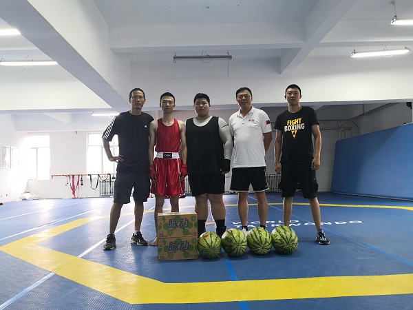 7月14日下午5点,体育部党总支书记王生毅、体育部副主任任启俊、体育部副主任王斌看望了暑假有比赛任务的几只代表队(网球队、田径队、拳击队),他们即将参加全国大学生比赛,比赛在即,集训环境很艰苦,室外地表温度47度,室内温度平均35度,网球队、田径队冒着酷暑在室外训练。