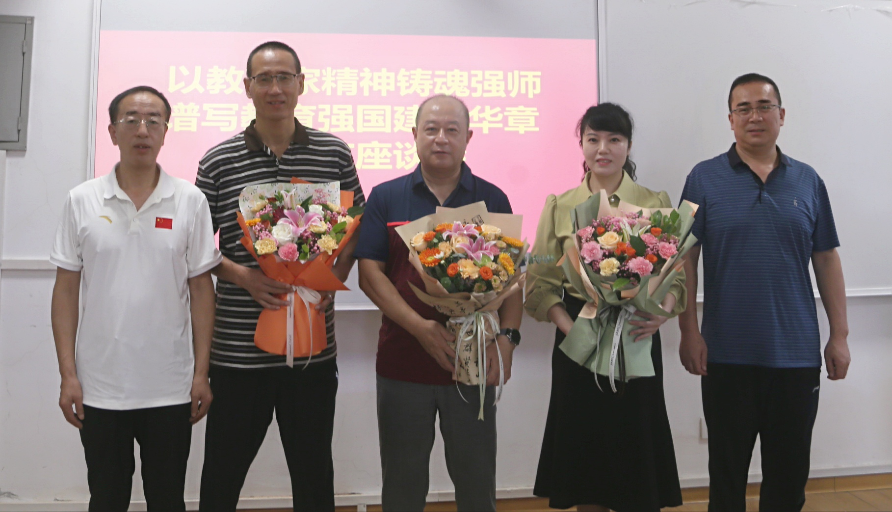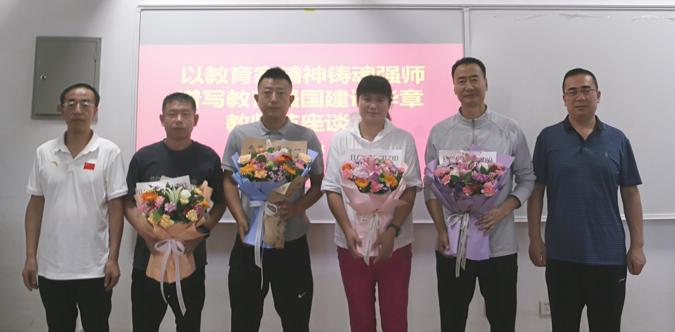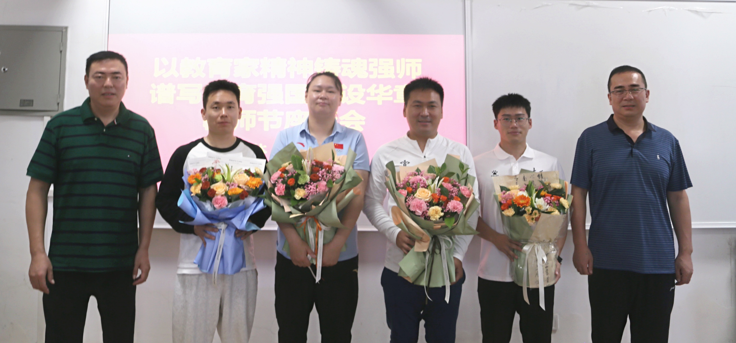 座谈会现场,举行了隆重的献花表彰仪式。体育部领导班子成员分别为在体育教学、群体竞赛、运动训练、科研创新等领域表现突出的19名教师献上鲜花。“这份荣誉不仅属于个人,更属于每一个并肩作战的体育人。