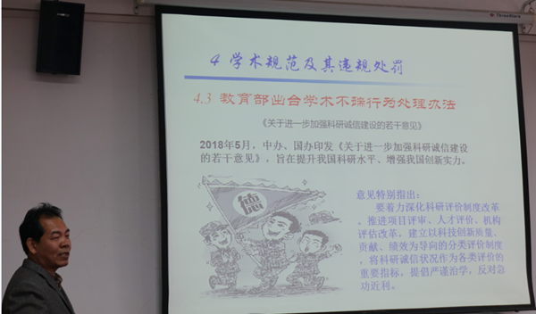 骆教授首先以我校“诚朴勇毅”校训的“诚”为引言,列举大家熟知的古代诚信案例,引起参会人员的浓厚兴趣,然后开始讲述学术道德相关定义,详细介绍了学术不端行为现状及其危害和学术规范及其违规处罚等具体内容,结合国内外典型学术不端行为案例,告诫广大教师遵循学术规范切勿心存侥幸,要恪守科学道德与学术规范,进一步提高自我约束能力,严肃学术纪律,规范学术行为,坚守诚信底线,切实树立不踩红线的底线思维和求真务实、严谨自律的科学精神。