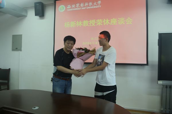 闫祖书副书记为杨新林教授颁发荣休证书和纪念品,教师代表谷健为杨新林教授献上鲜花,与会人员合影留念。