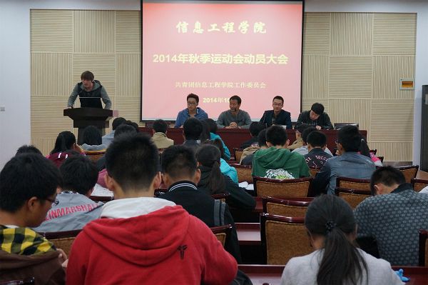 信息工程学院定于10月18日举行2014年秋季运动会,为鼓舞士气,学院于10月15日晚在院副203会议室召开了赛前动员大会举行。会议由学院团工委书记党艳东老师主持,出席会议的有学院体育辅导员杜养军老师、学生会干部成员及13、14级各班的班长、团支书和体育委员。党艳东老师和学生会干部就纪律要求等方面做了动员和要求,杜养军老师就学生干部和运动员的参与热情做了进一步的动员。会后还安排杜养军和徐立国两位老师对担任本次比赛裁判任务的学生进行培训指导。