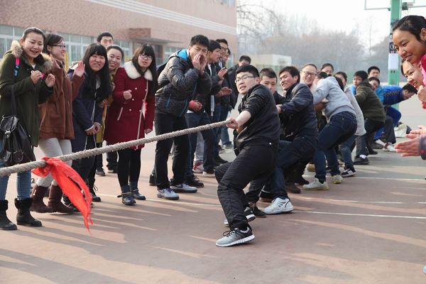 裁判员一声 “预备”口令后,队员们都摩拳擦掌,攒足劲头蓄势待发。只听一声哨响,拔河的同学拼尽全力,拉拉队的同学拼命的喊着整齐的口号。平时斯文的女生,在比赛中也放下了淑女风范,用尽全力“拼杀”。在这短暂的时刻,各参赛队员都为一个共同的目标,进入忘我的境界。赛场上不断涌现出一浪高过一浪的欢呼声。