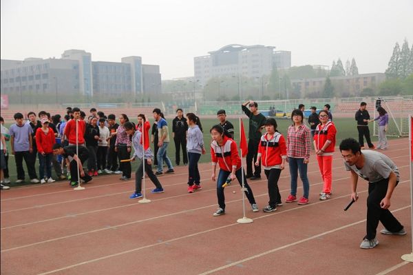 运动员们尽最大的努力为班级而拼搏,其他的同学自发组成啦啦队为运动员们呐喊加油,还有后勤队的同学贴心的为运动员们准备好了矿泉水,并在终点迎接我们辛苦的运动健儿们。在参与者的默契配合下以及同学们的加油欢呼中,一组组的同学顺利到达了终点。活动中的欢笑让我们忆起童年般的乐趣,爽朗的笑声成了我们的主旋律。也有的同学在比赛中摔倒,但是他们毫不放弃,迅速爬起来继续跑向终点。一份份欢乐,一幕幕感动。