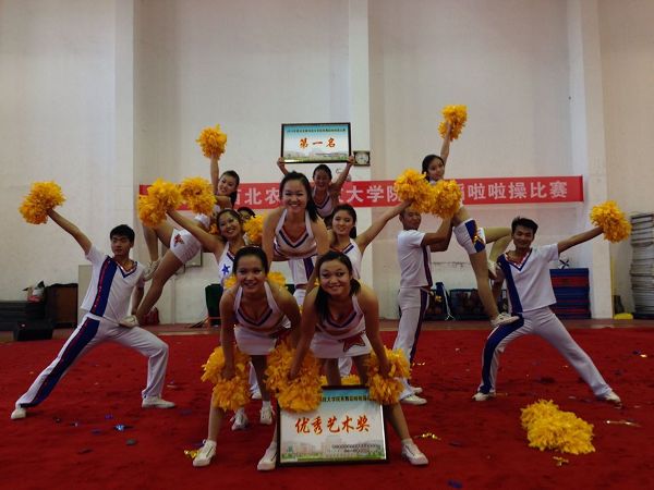 当天下午两点四十分,来自我院大一至大四的14名队员在加油团的呐喊助威声中闪亮登场,整齐有力的动作,完美轻巧的抛接,甜美灿烂的笑容,让比赛现场成为了欢快的海洋。我院啦啦操队有序地变换着阵型,各种高难度动作花样翻新,层出不穷,赢得场外观众的阵阵欢呼。他们的精彩表现折服了现场评委。最终,机电代表队以48.82的高分再一次获得比赛的冠军,并获得最佳艺术奖。