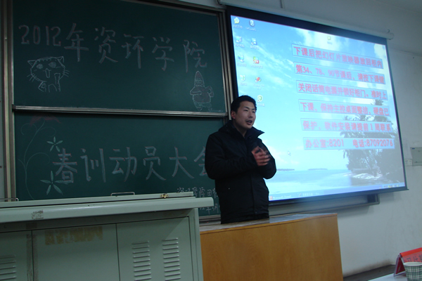 3月5日19时30分,资环学院在8218教室召开2012年春训动员大会。体育辅导员郝国防老师、团工委书记马佳慧老师、11级辅导员王波老师及100余名春训队员参加此次动员大会。
