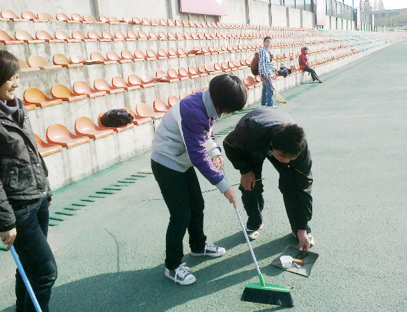 下午2点他们自带清扫工具,走进体育场开始工作。由于体育场长时间没有清扫,显得又脏又乱,可他们丝毫不怕,不能扫动的垃圾用手去抠,有的同学到观众席后去搜寻垃圾。同学们劳动热情非常高涨,诺大的体育场闪现的是他们辛勤的背影和挂满汗珠的笑脸。数小时后,从足球场到田径跑道内外,所有的垃圾都被他们清扫一空